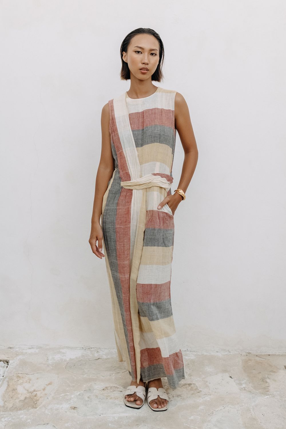 Learn More.Straight fit dress in multi-stripe handloom kala cotton fabric which has side panel in vertical stripes attached with a fixed hand draped belt. Feature a round neck and keyhole at the back with side inseam pockets which makes it more comfortable to wear.