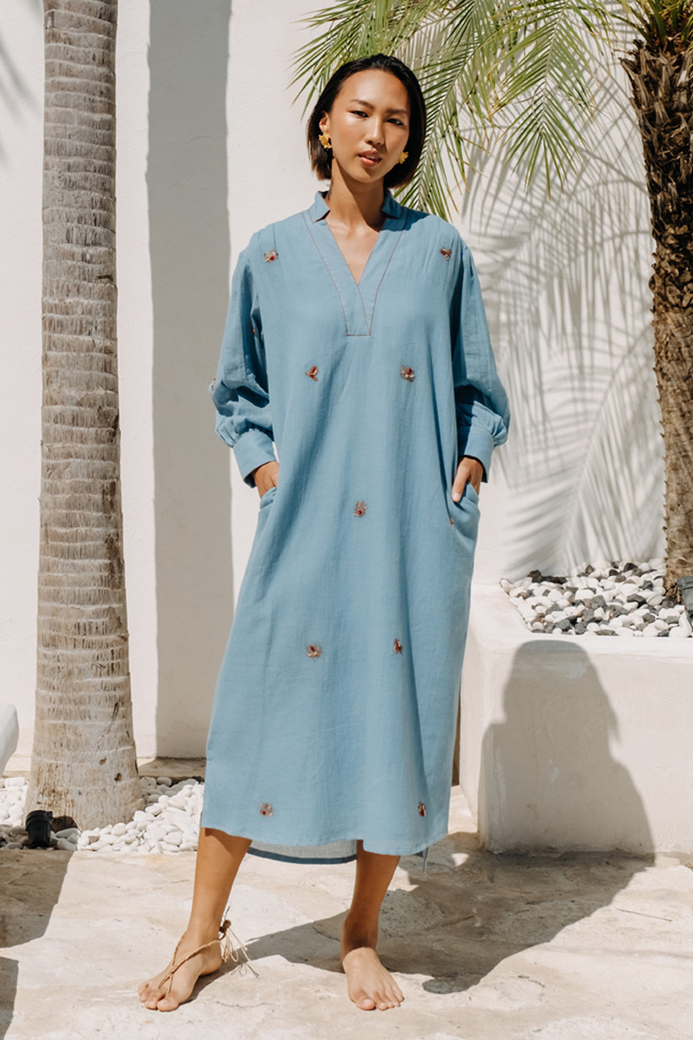 Learn More.Hi-Low straight fit dress tailored in textured cotton with inseam pockets featuring all over hand embroidered motifs and stitching detailing on the seam lines. Gathered detailing on the shoulder and sleeves add to the distinctiveness of this dress.