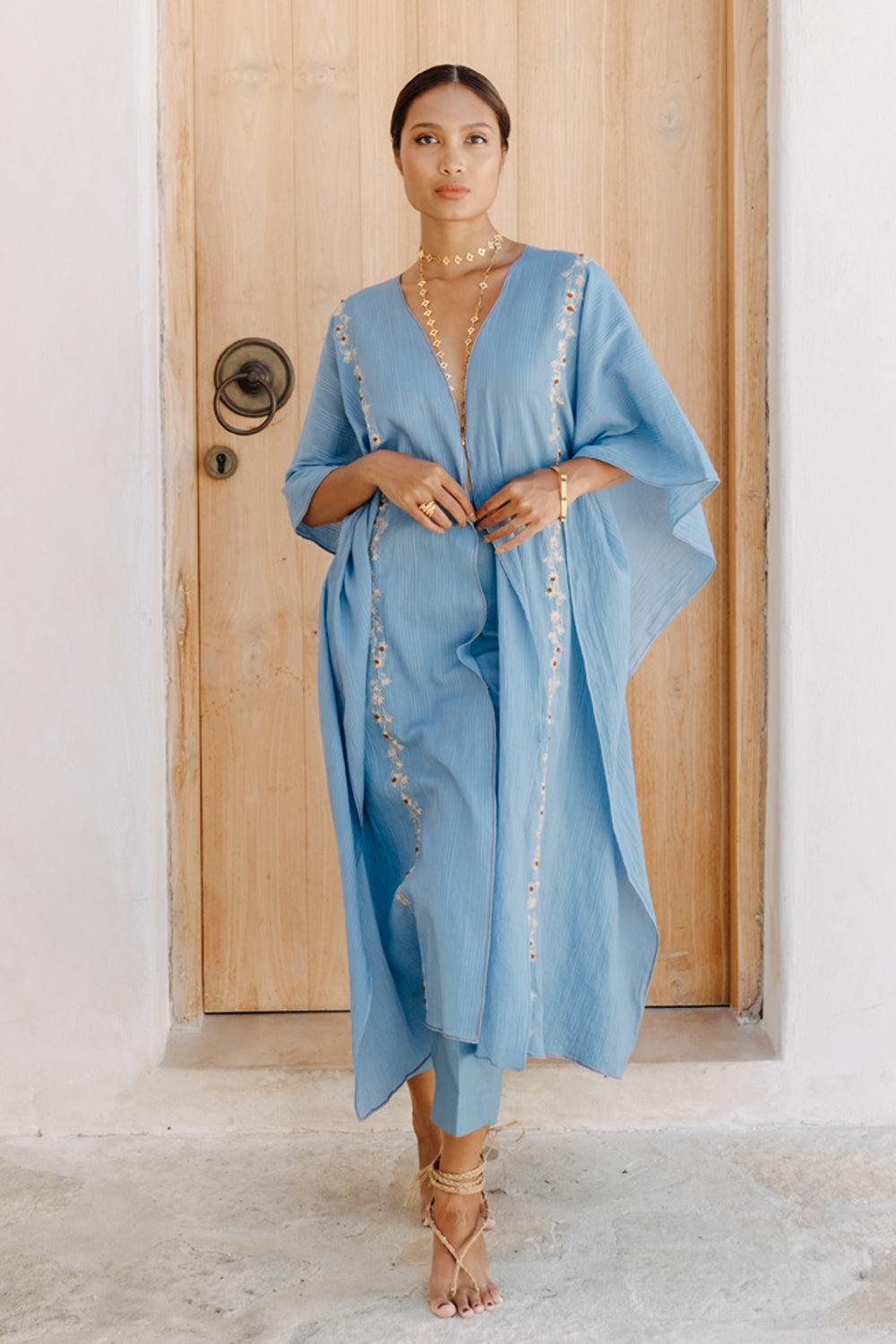 Learn More.A two piece set featuring an embroidered overlay with solid pants. The overlay has kaftan style fit with side slits, embroidered front and hand detailed at the seams. The pants are high waisted with back elasticated waist and side pockets