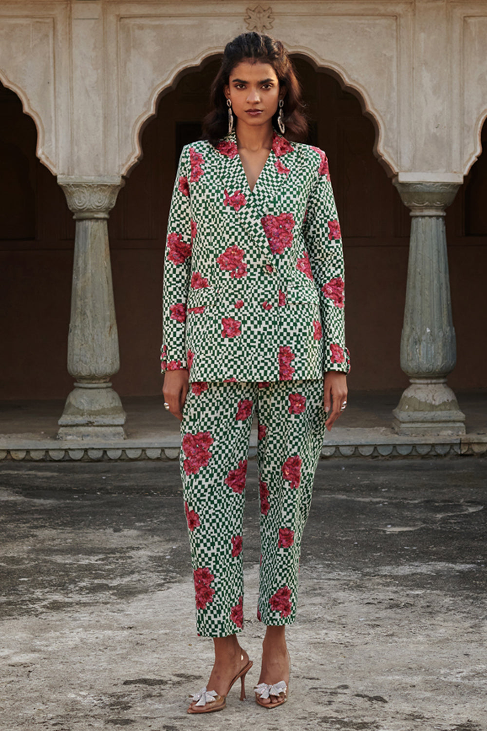 Step into bold sophistication with oversized pant suit. Featuring a double breasted blazer, adorned with exquisite hand embroidery on blazer. Designed for comfort, the oversized fit and padded shoulder offers a modern silhouette. Paired with hand embroidered  straight fit pants featuring half elasticated belt and side inseam pockets.