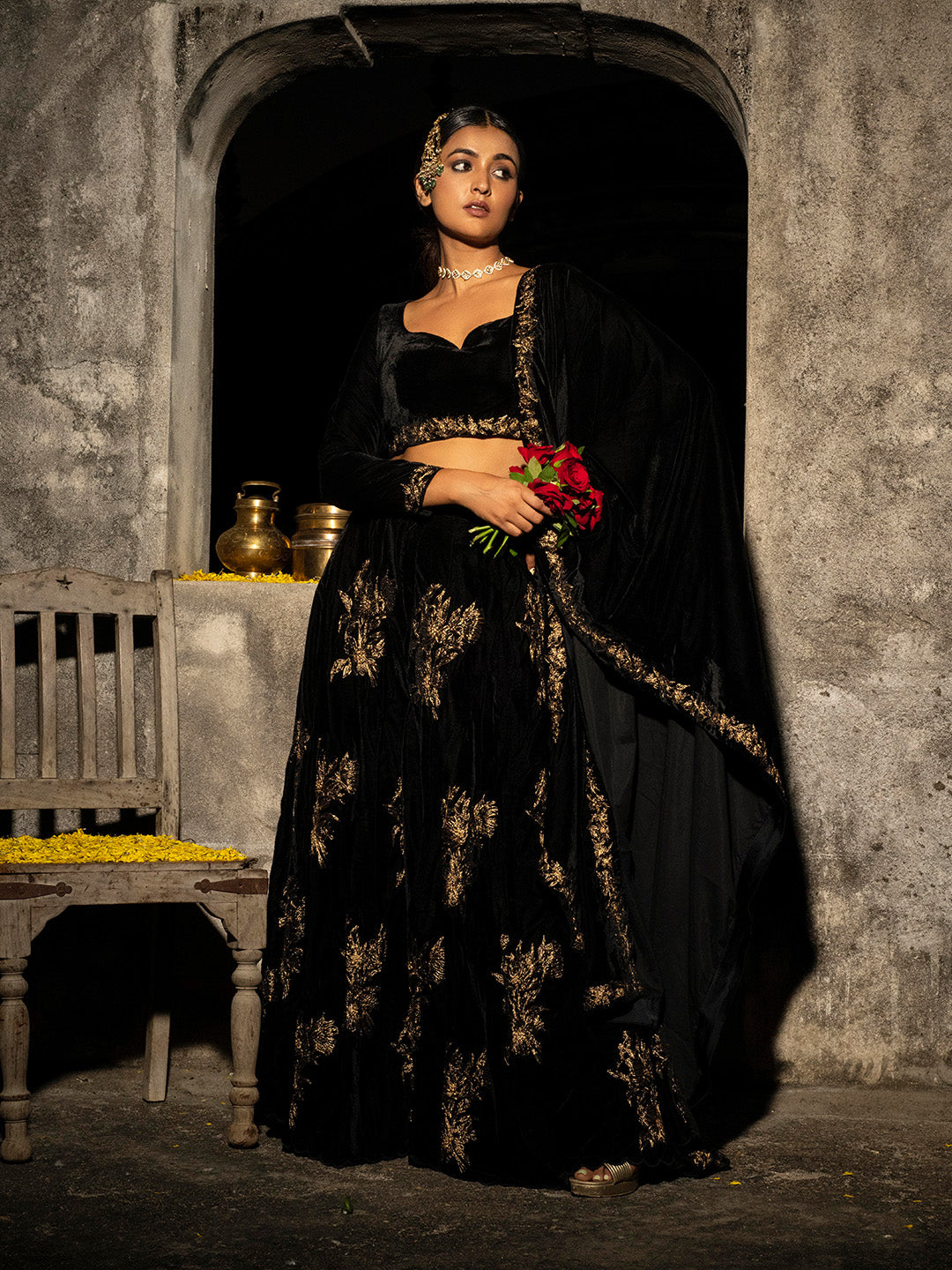 Learn More.The Sharara has embroidered motifs with zari work and highlighted with sequins. Blouse is made in full sleeves with hand embroidery on the hem of sleeves and bottom. Dupatta has zari embroidered border on all four sides.