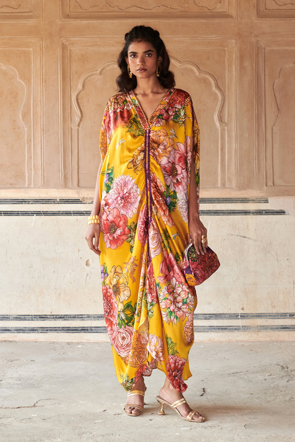 Learn More.The stunning relaxed fit kaftan is crafted from our Sunset Garden print. This has gathers in the center front and tasseled knot at the bottom and drop down shoulders. The kaftan is adorned with delicate hand embroidery on the neck and shoulders.
