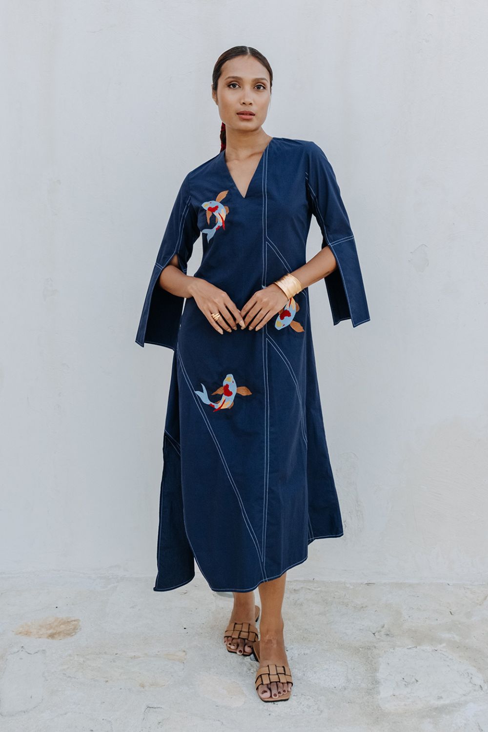 Learn More.Asymmetric Dress with statement sleeves and side inseam pockets give comfortable yet an elegant look. The dress has hand-embroidered fish motifs and stitching detailing all over the seam line of the dress.