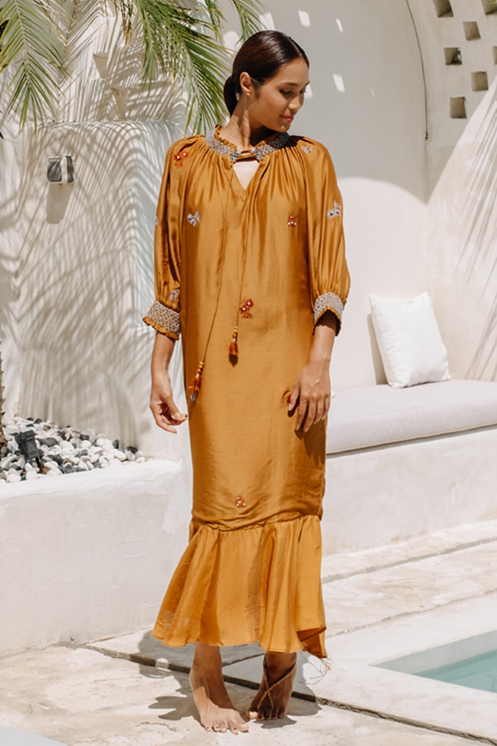 Learn More.Midi dress crafted from muslin silk features hand smocking and embroidery on the neckline and sleeves, a midi hemline and embroidered motifs all over the dress.