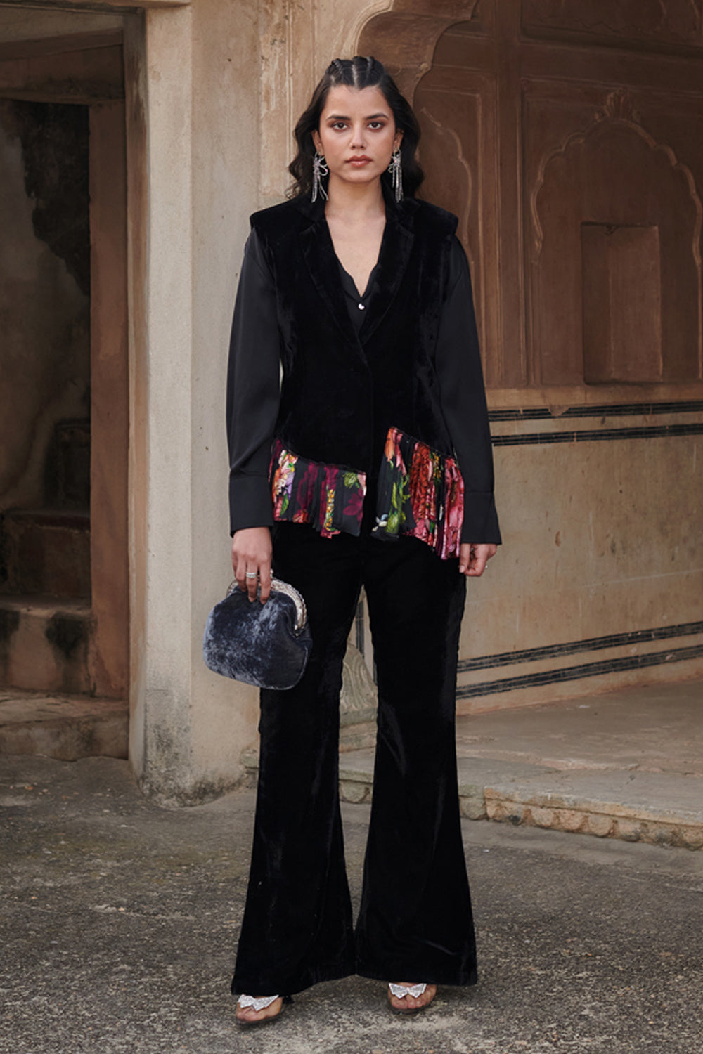 Learn More.This black blazer features a sleeveless design and a front button clouser with padded shoulder. The blazer is detailed with Noir Florale fabric ruffle trims which adds a unique stylish touch and make it modern stapple. A pair of boot cut pants featuring half elasticated belt and side inseam pockets.