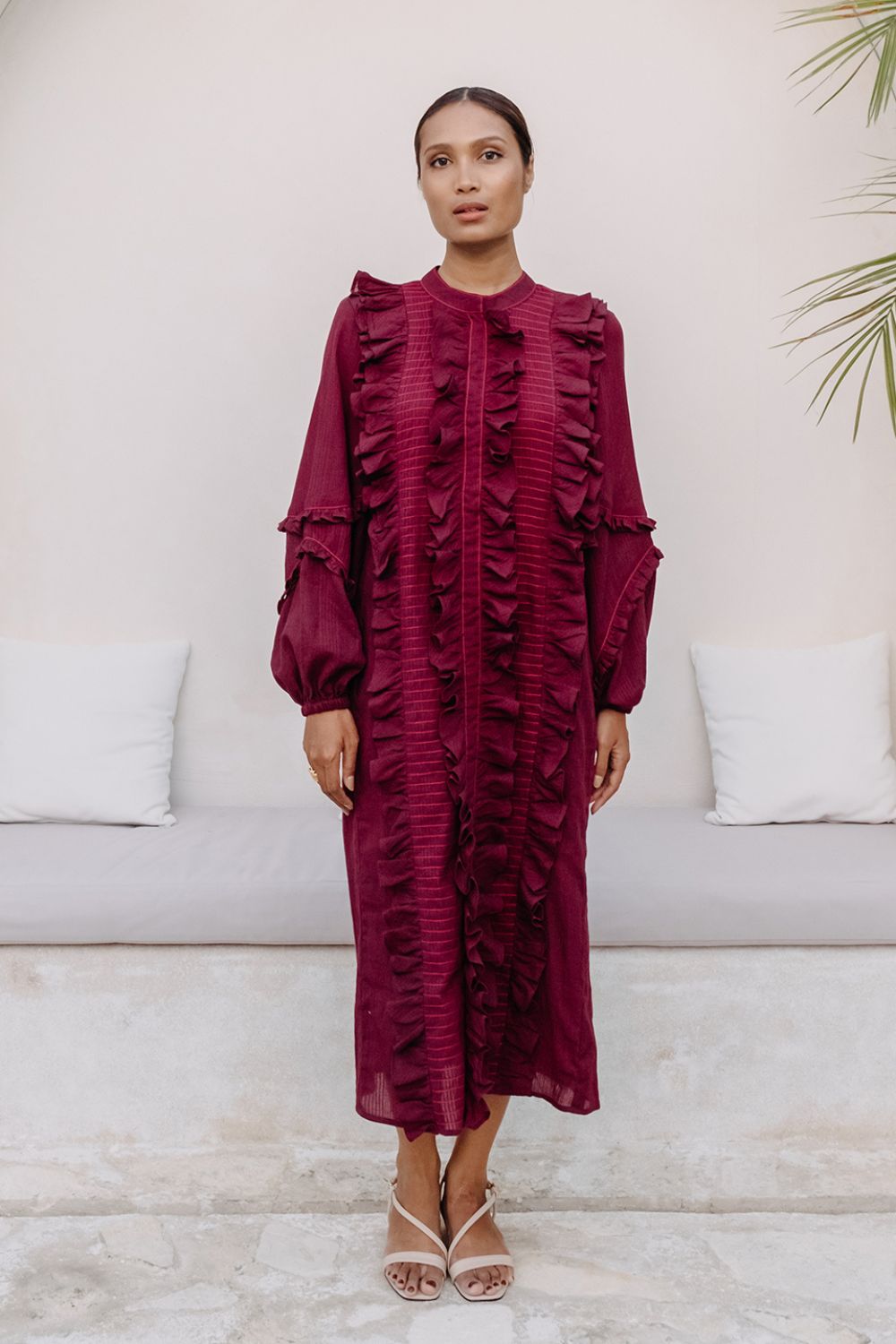 Learn More.A Straight Fit Midi Dress with ruffles down the front and elasticated ruffled sleeves with side inseam pockets. Highlighted with contrast stitch details and tagai.