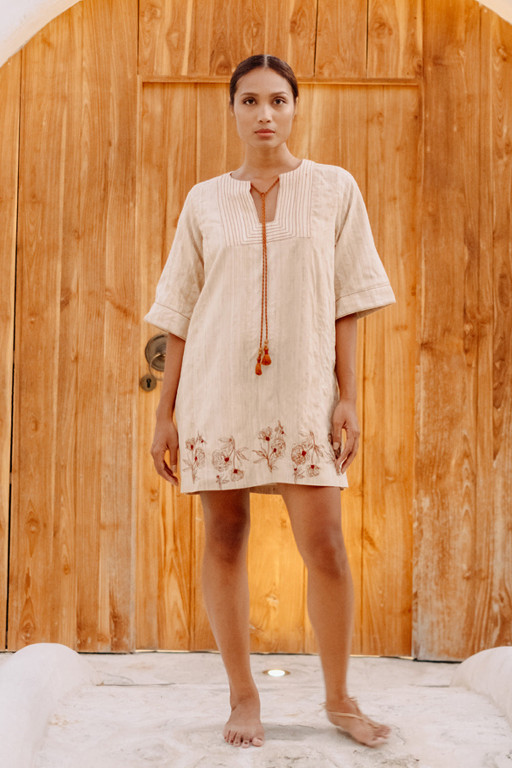 Learn More.A relaxed fit short dress with embroidery detail at the bottom featuring round v neckline with draw-strings and short relaxed fit sleeves. The dress is highlighted with stitching detail.