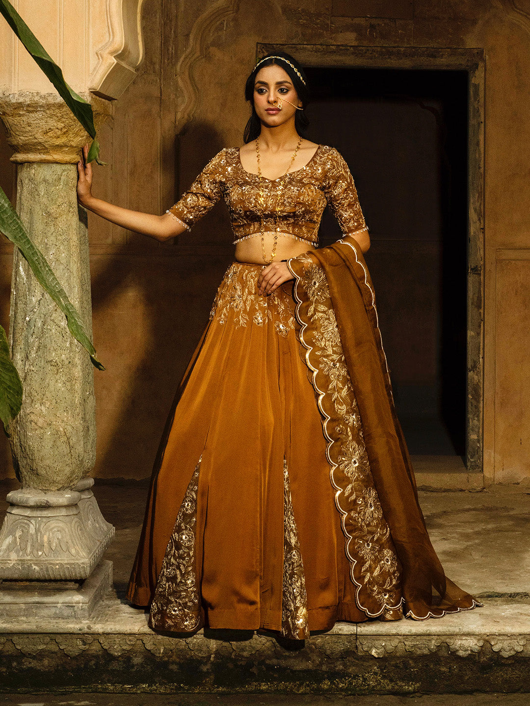 Learn More.The Blouse is embroidered with heavy zari work and highlighted with sequins and cutdana. Lehenga has silk organza panels attached to every alternate kali. The silk organza panels and waist of the skirt has embroidery accentuated with zari work and highlighted with sequins and cutdana . Dupatta is scalloped which is detailed with sequins. One side of the dupatta is hand embroidered.