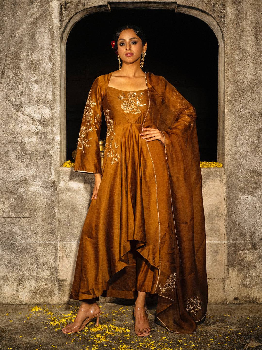 Learn More.The sleeves of the tunic has detailed embroidery. Asymmetric tunic is accentuated with an embroidered motif at the front and back. Matching straight pants with elasticated belt. The organza dupatta has embroidered motifs at four corners.