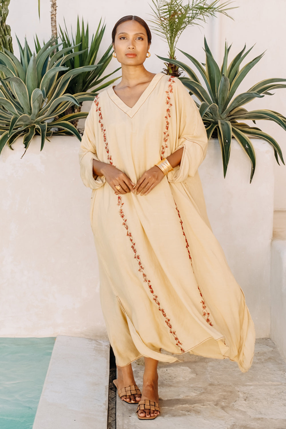 Learn More.A relaxed fit kaftan dress tailored in muslin silk which is detailed with hand embroidery and stitching detail with contrast thread on the seam lines. The dress features V-neck, inseam pockets and side slits. Comes with Cotton slip.